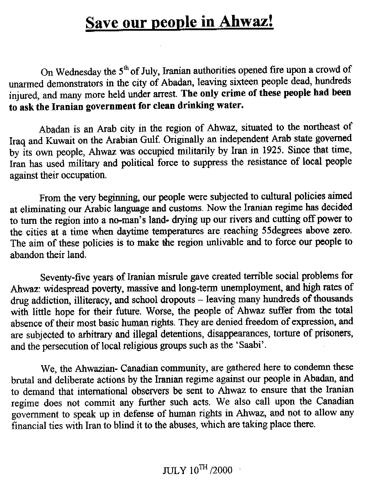 في 10 يوليو 2000 نظمت الجالية الاحوازية الكندية مظاهرة تضامن مع اهلنا في مدينة عـبادان العـربية احدى مدن الاحواز ، واحتجاجا عـلى سلطات الاحتلال الفارسي واجراءاته التعـسفية بقطعه مياه الشرب والكهرباء عـن تلك المدينة الاحوازية العـربية فالوقت الذي كانت درجة الحرارة تتراوح بين 54 - 55 درجة مئوية في الظل ، حيث كانت تلك المظاهرات التي شهدتها مدينة عـبادان بداية يوم الخامس من يوليو 2000 ، وقد نشرت شبكة الاحـواز للانترنت تفاصيل انباء احداث عـبادان الاخيرة ، وجاءت مظاهرات الاحوازيين الكنديين في مدينة تورونتو احدى كبرى المدن الكندية التي بداءت الساعة العاشرة والنصف واستمرت لغاية الساعة والواحدة ظهرا حسب توقيت مدينة تورونتو تأييدا ومناصرة لاهلنا الاماجد في عـبادان بل لكل مدن الاحواز المحتلة ، ورفعـت لافتات باللغة الانكليزية وضح الاحوازيون فيها هـدف التظاهر وفضح سياسات العـدو الفارسي ، وقد شرح المتظاهرون في مركز مدينة تورونتو للكنديين وغيرهم اسباب التظاهر وشرح الاجراءات الفارسية التعـسفية الاخيرة التي تعـاملت فيها السلطات الفارسية تجاه سكان عـبادان وبيان الاسباب الحقيقية وراء احداث عـبادان ، وقد وزعـت 400 نسخة من المنشورات السياسية التي تشرح الاحداث ومعانات الشعب الاحوازي ، كما القيت خطابات باللغة الانجليزية تشرح معـانات الشعـب العـربي الاحوازي في ظل الاحتلال الفارسي ( الايراني ) بقيادة ملالي فارس الذين يدعـون الاسلام والاسلام منهم ومن تصرفاتهم براء الى يوم الدين ، انهم يحللون ماهو حرام شرعـا ويحرمون ماهـو حلال شرعـا وفق مصالحهم السياسية التي كان الاسلام واضحا فيها لا يقبل الظلم اي ظلم ، ولا يقبل الباطل اي باطل ، ولا يقبل ان تأخذ الحقوق من اصحابها الشرعـيين مهما كانت الاسباب او الظروف او المبررات ، والحق يبقى حق في ميزان الشريعة الاسلامية ، والاسلام كدين وعـقيدة وسلوك وفكر ومنهج و تصرف واضح وضوح الشمس ، ولكن الاحتلال الفارسي في ظل شاهاته وفي ظل رجال الدين هـما وجهان لعـملة واحدة لا يختلف بعـضهما عـن بعـض بشيء ، الظلم هو نفسه ، والتمييز العـنصري لا يختلف ايضا ، والاجراءات التعـسفية كما هي بل الى الاسوء ، والاحتلال والاستيطان الفارسيين كما هما منذ عـام 1925 ليومنا هذا ، والسلطة الفارسية شاهنشاهية كانت او دينية تتحرك وفق مصالح عنصرية فارسية بحته ، وليس من منطلق اسلامي ، الاسلام يستخدمونه كستار لتمرير مخططاتهم الاستعـمارية والاستيطانية في اطالت آمد الاحتلال والاغـتصاب للأحواز العـربية الغـنية بالبترول والثروات الطبيعـية الاخرى والتي هي من اخصب بقاع العالم .