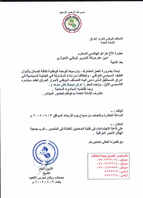 • شاركت حركة التحرير الوطني الأحوازي بوفدها برئاسة عضو قيادتها الأخ المناضل الكبير نصار الشيخ خزعل والأخ المناضل الكبير ابن الزبيدي عضو القيادة المركزية للحركة في المؤتمر التأسيسي للتحالف الوطني لاحرار العراق الذي انعقد في 3 / 8 / 2005 ، وكان لوفد حركة التحرير حضورا متميزا في شرح القضية الأحوازية وكان المؤتمرون ابدوا تعاطفا ملموسا مثل الاصالة العربية العراقية ، والقى الأخ نصار الشيخ كلمة الحركة في المؤتمر ، نص الدعوة .