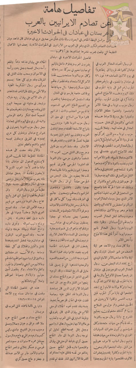السعادة نقلا عن شاهد عيان أحوازي لصحيفة اليقظة العراقية تفاصيل هامة عن تصادم الايرانيين بالعرب في عربستان في عبادان في الحوادث الاخيرة . تلقى مراسل اليقظة الخاص في البصرة رسالة ذات شأن من صديق عربي في عبادان كان شاهد عيان لحادث التصادم الكبير الذي وقع على العرب من الايرانيين في الحوادث الاخيرة يصف فيها الاعمال الفظيعة التي وقعت للعرب ننشرها بحذافيرها نظرا لاهميتها : تفاصيل الحوادث الاخيرة في عبادان ان رجال اتحاد العشائر العرب عبادان كانوا قد قرروا ان يتظاهروا في يوم الاثنين المصادف 15 تموز 1946 في عبادان والحضور في بناية مركز الحزب لرفع العلم على بناية الحزب في ذلك اليوم وعقد الاجتماع السلمي والمذاكرة في شؤون الحزب . لما علم رجال حزب تودا ( حزب شيوعي فارسي ) في هذا الامر واجتمعوا واهتموا كل الاهتمام وتشبثوا بكل وسيلة لاحباط هذه المساعي والتوصل الى فشل حزب العشائر ( حزب السعادة ) في هذه المهمة . وفعلا فان حزب تودا مع الذين يحركونهم قد قرروا الاضراب العام لكي لا يتسنى لرجال العشائر العرب الحضور في عبادان لعقد الاجتماع الثوري عقده في يوم الاثنين ، وفعلا فانهم قد قاموا بالاضراب العام ونفذوه بالقوة والاكراه ومنعوا بالقوة المسلحة جميع المشتغلين في وسائط النقل من العمل في ذلك اليوم وسيطروا على جميع الطرق والشرايع والشوارع وبذلك قد شلوا الحركة تماما واصبح من المستحيل على العرب تنفيذ اجتماعهم الامر الذي جعل روساء العشائر العرب ان يكونوا مضطرين لالغاء اليوم المعين للتظاهر وهو يوم الاثنين ، وذلك لعدم وجود وسائط لنقل العشائر العرب وايصالهم الى عبادان ، وقالوا ذلك اليوم واخبروا رجال العشائر بانهم سيعينون يوما آخر لمثل هذا الاجتماع وانتهى الامر .