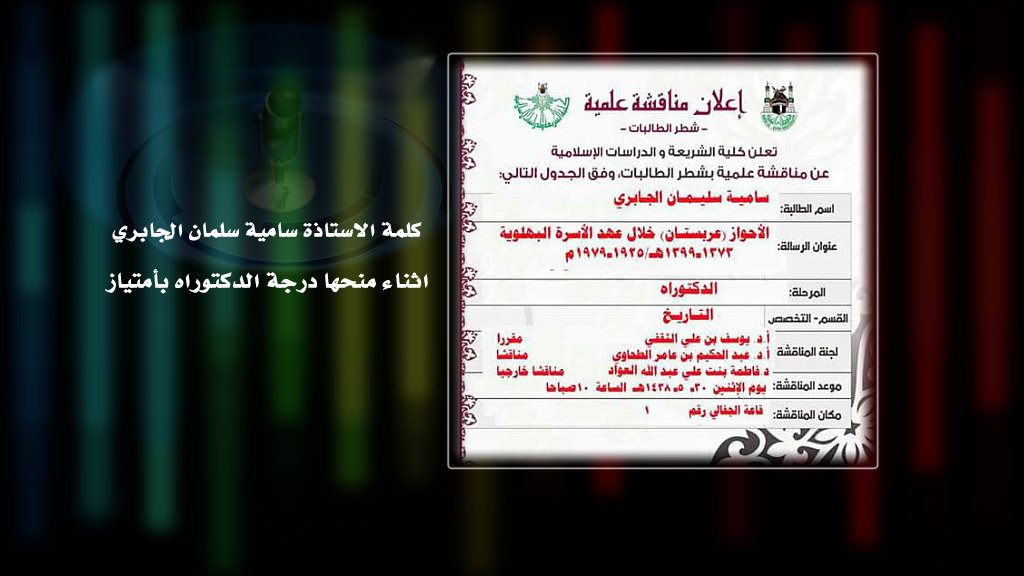 شبكة الأحواز – الرياض : تقدمت يوم الاثنين 27-2-2017 الاستاذة سامية سليمان الجابري باطروحتها التاريخية حول الأحواز (عربستان) خلال عهد…