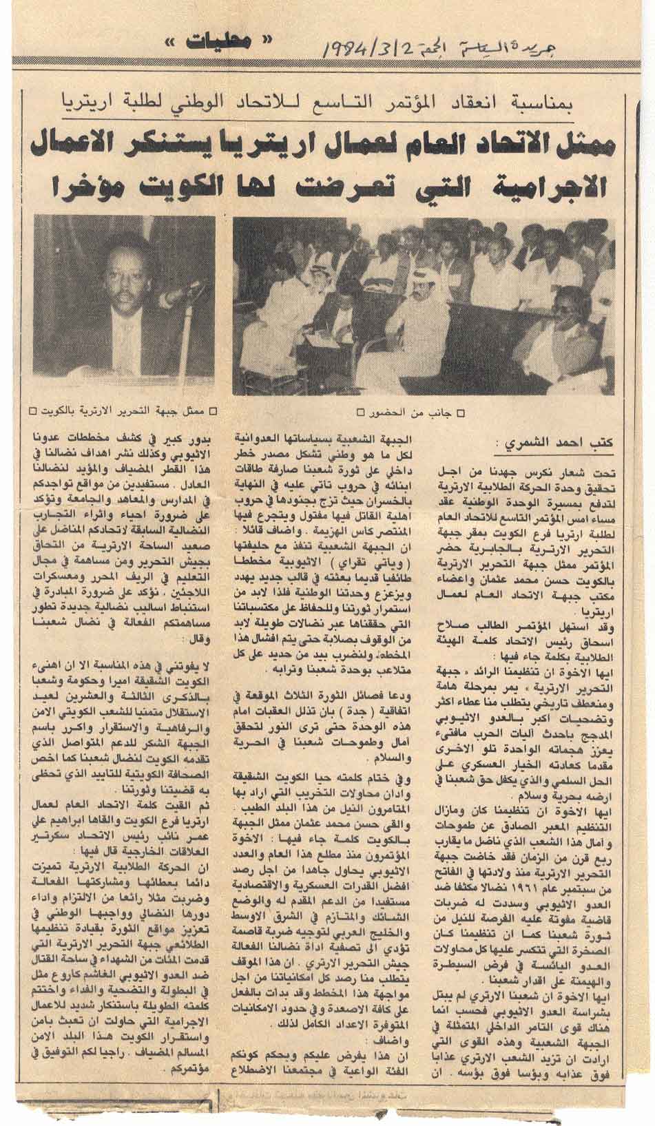 وثيقة رقم 2 : وفد الاتحاد العام لطلبة وشباب الأحواز يشارك في مؤتمر الثورة الارتيرية ويبدو سيد طاهر آل سيد نعمة ممثل الاتحاد العام لطلبة وشباب الأحواز مع الشهيد الملازم اول كريم الكعبي ( ابو احمد ) رحمه الله عضو اللجنة التنفيذية لحركة التحرير الوطني الأحوازي الى جانب الايمن لممثل جبهة التحرير الارتيرية حسن محمد عثمان - جريدة السياسة الكويتية ليوم الجمعة 2 / 3 / 1984 م