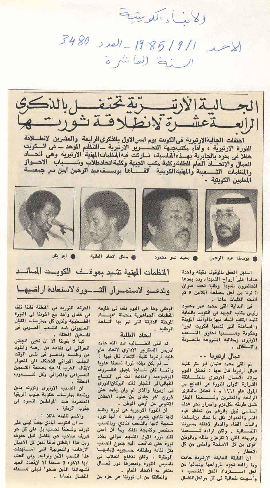 وثيقة رقم 3 : مشاركة وفد الاتحاد العام لطلبة وشباب الأحواز وحركة التحرير الوطني الأحوازي في احتفالات الذكرى الرابعة عشر لانطلاقة الثورة الارتيرية ، والقى رئيس الوفد الاحوازي كلمة الأحواز في تلك الاحتفالات وتم فيها شرح القضية الاحوازية للجماهير التي شاركت في الاحتفالات - عن جريدة الانباء الكويتية 1 / 9 / 1985 م