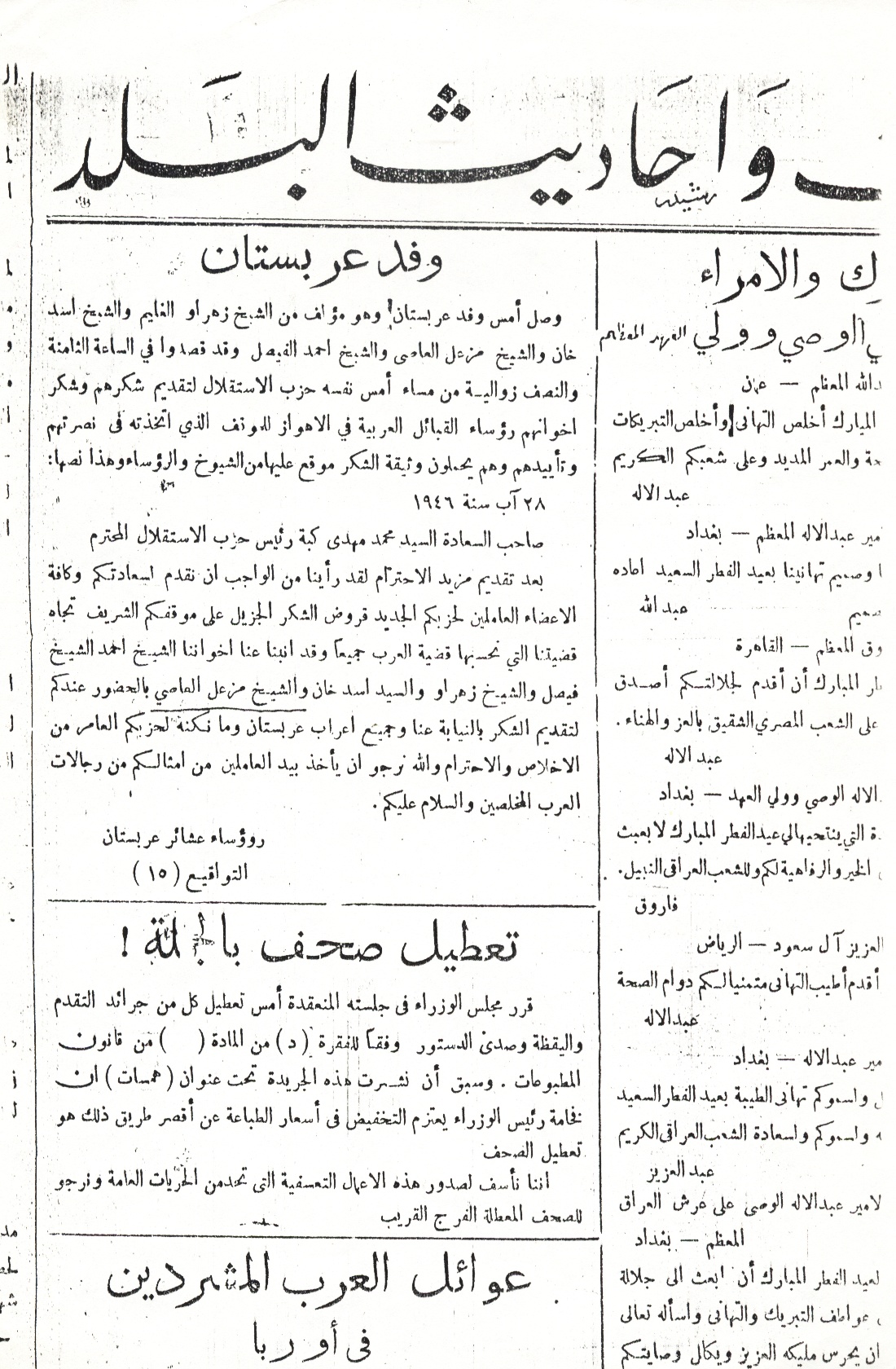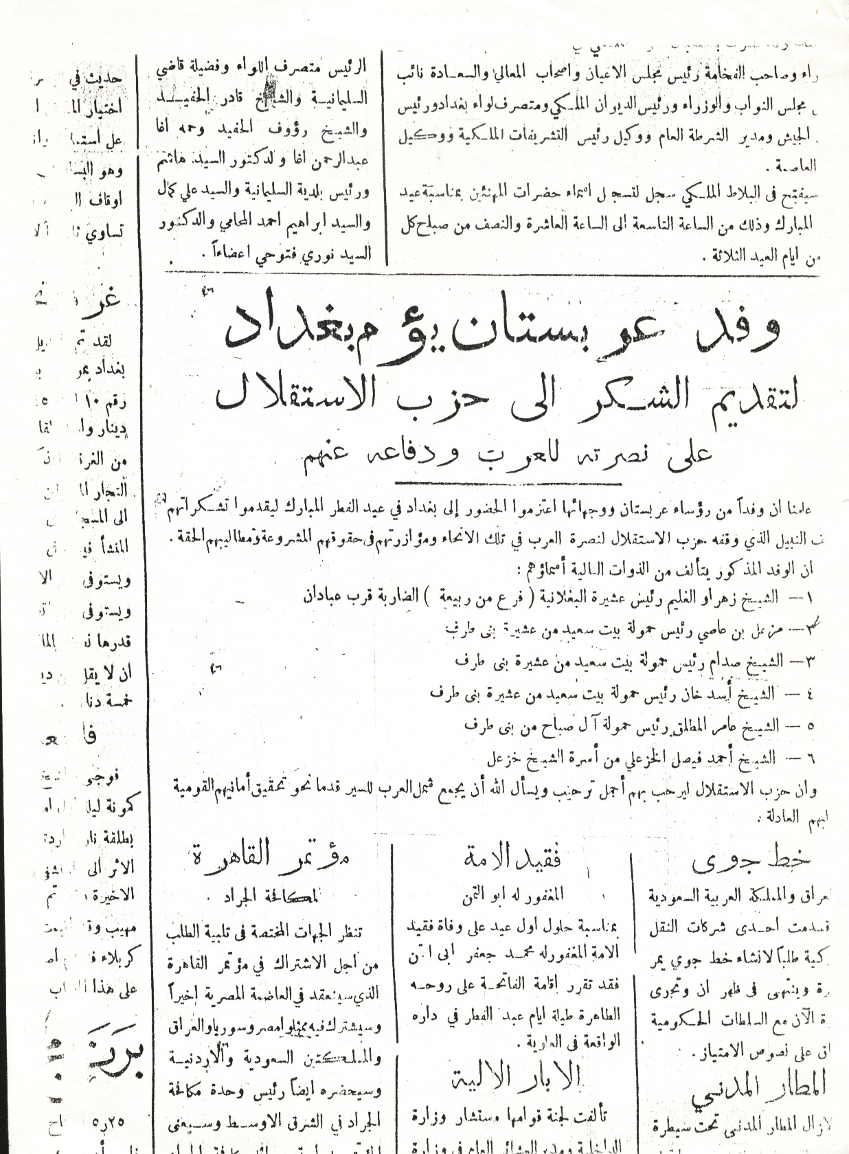 في 2 آب ( اغسطس ) 1946 توجه هذا الوفد الى بغداد بعد أن مهد الشيخ أحمد الفيصل لهذا اللقاء ، ولا داعي لأن نسرد الواقعة بالكتابة عنها ؛ لكن ها هي الوثيقة وجريدة حزب الاستقلال هي التي تتحدث لتخرس الى الأبد من يحاول بدفع من الاطلاعات الايرانية تشويه صورة نجوم الأحواز اللامعة ولنسأل مثل هذا النفر الظال هل تعرف هذه الأسماء ومن يكونون ويشكلون من ثقل داخل الأحواز كي تتفوه عنهم بسفاهة وقلة وعي ؟؟؟